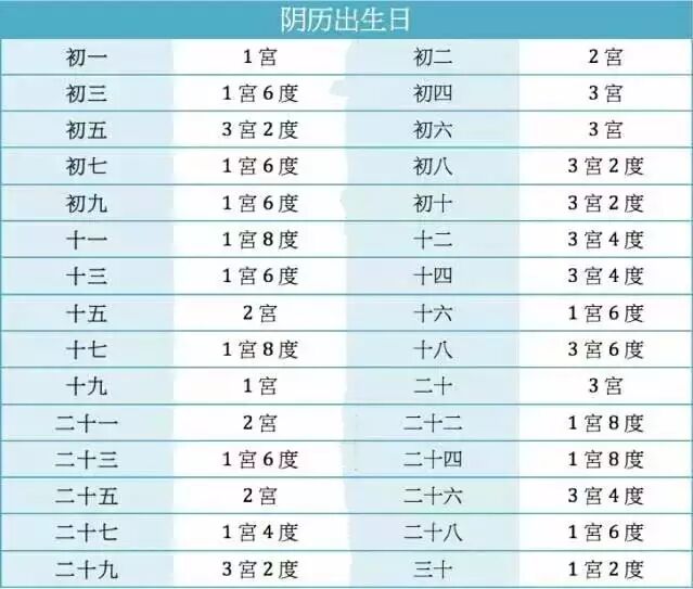 算法:将个人的阴历出生年丶月丶日丶时相对的「宫与度」全部相加(十度为一宫)