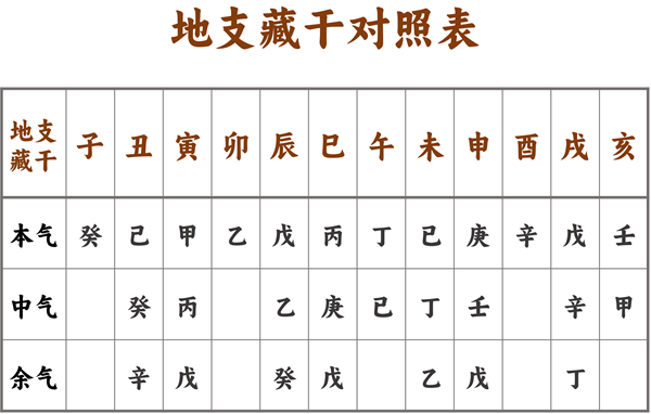 步骤1、2参考上述《天干地支阴阳五行对照表》和下述《地支藏干对照表》。