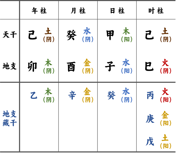 仍以上述八字为例,四柱干支及地支藏干转换后的五行能量如下: