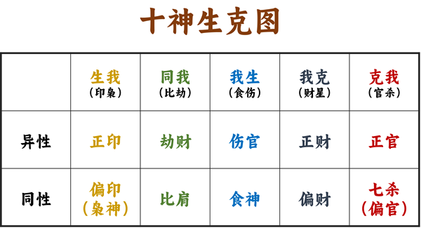 再深入一步,相对于日元的五行能量以阴阳划分,又衍生为十种能量,即十神。用神,实际上是从十神中来取。