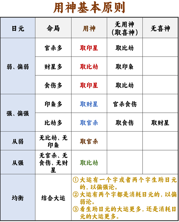 确定了日元能量偏弱,我们就可以借助《用神基本原则》来分析判断,快速找出用神了:在该组八字中,有三个财星,两个官杀,财星多,用神取比劫,用神的五行为木。水生木,则喜神的五行为水。