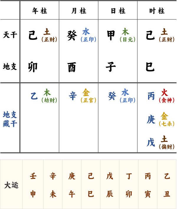 仍以上述八字为例,我们前面分析出该组八字中的日元能量为均衡,那么就需要结合大运来进一步分析。日元为木,那么包含:甲、乙、壬、癸、寅、卯、子、亥的大运才算生助日元。